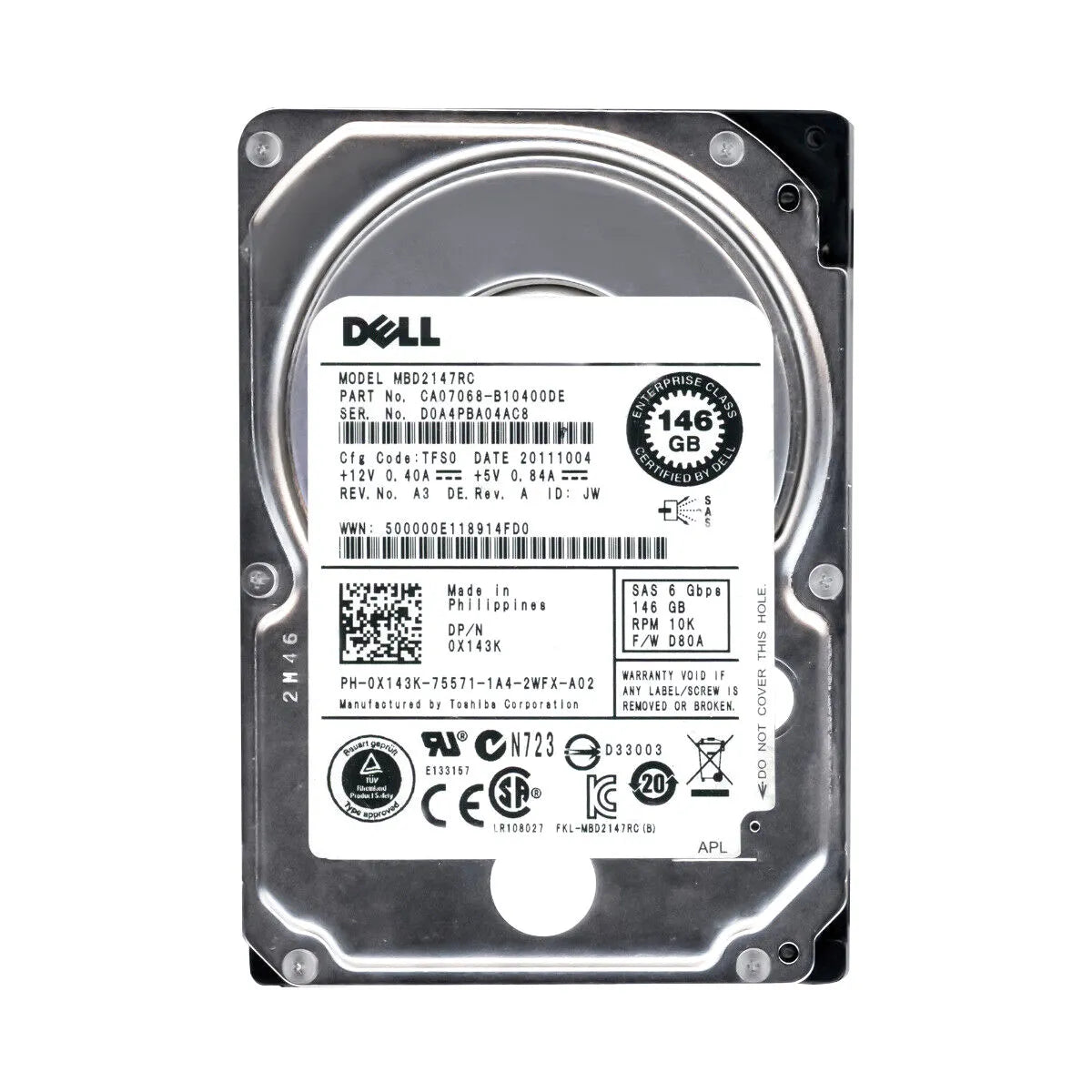 Dell 0X143K 146GB 10000RPM SAS 6Gb/S Hot-Pluggable Single Port 2.5-Inch Hard Drive With Tray For PowerEdge Server Dell Part Number: 0X143K